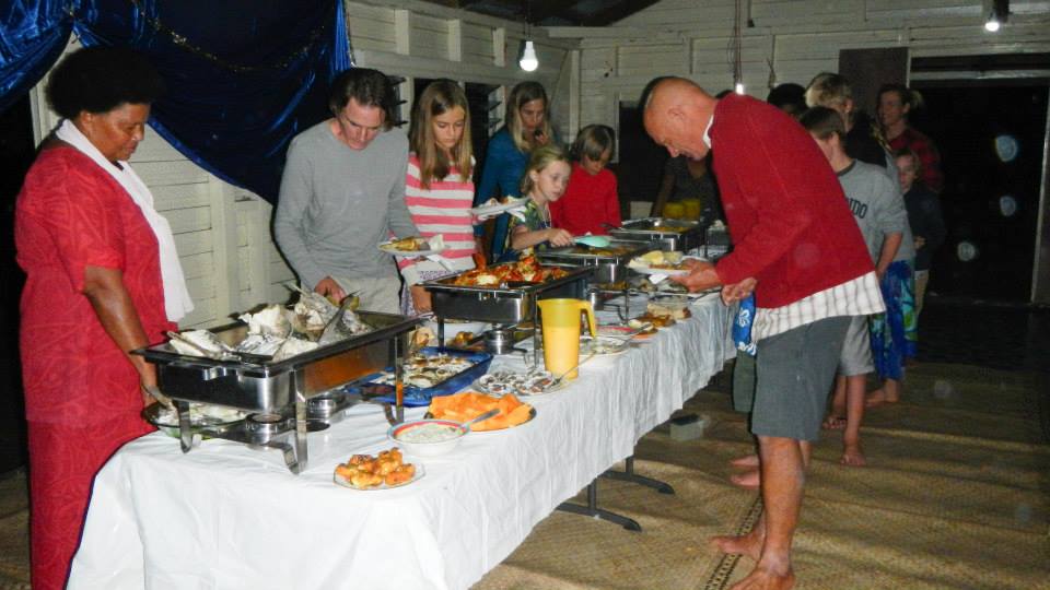 While we were there, the people of the village invited us to their church fundraiser. It came across as if it were something they were planning independent of our presence, but since we were there we were welcome to join them. So, then they had very good luck with their timing, because the church probably raised quite a bit more money than it would have. The feast and the fun evening were more than worth the donations we all contributed. They had a full spread of food, but a noticeable difference between this meal and the meals we had in Fulaga was that this one had a decidedly much more western feel to the presentation. First of all, it was all set up on folding tables with table cloths, and second, they used burners to keep the food warm as it sat there, similar to what they used to use at catered work lunches. But not to take the western theme too far, the food was very much Fijian and we still all sat on mats on the floor, so that was a relief. Most of the evening the kids all ran around outside playing games and having fun. After the meal, the men all stayed well into the night to drink some kava while the moms and kids retreated back to the boats. In contrast to Fulaga, here it was really only the men drinking kava rather than it being a mixed gender activity.