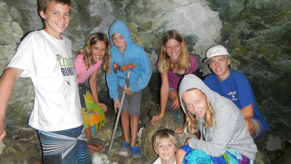 Someone heard from someone that there was a cave with human bones in it from back in the cannibal days, so of course we needed to set off to find it. We were three adults, Tim, Danny (Lumbaz), and me, and we had all the kids from Exodus, Lumbaz, and Nautilus with us. The first part of the hike was flat and uneventful, and amazingly we found the cave with the bones quite easily. After taking some photos and telling the kids more than once that, “No, you can’t play with the bones,” we were off again. We headed the other way, towards the ocean side of the island, and after a slight incline and then short steep decline, we found ourselves in a mangrove swamp. The Exodus normal routine is for Tim to go ahead and scout while I wait, so we followed this usual routine, but I didn’t see Tim again after that. He called from up on the ridge to head back up and then over, so we filed back up and headed in the direction we thought he was telling us to go. At the time I had the impression that Danny had seen and talked to Tim, but in the end I’m not sure. Danny, the kids, and I hiked all across the island, never really knowing quite where we were but with a sense that we were heading back towards the lagoon. We covered some amazing geography; some the photos simply could not capture. There were steep little limestones valleys that looked like craters and there was lush green vegetation all around. We found another mangrove swamp and the mud was too deep to walk through. A couple of the girls tested it and then ended up with slippery, muddy feet that had trouble staying in their flip flops. So, then they had to go barefoot which was difficult because the ground was a lot of pointy limestone rock. As we approached near to our starting point, we found Tim again, who had an equally interesting hike across the island. The funny thing was that Seppe (9 years old from Nautilus) told him mom, and he was totally serious when he said it, that we all got lost and that Tim was the only one who didn’t get lost and next time he will stay with Tim. Too funny! How he concluded that we were the lost ones and not Tim is a mystery.