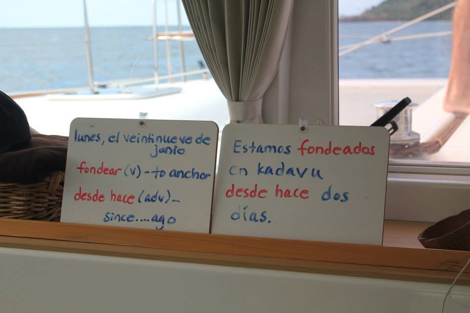 We navigated amongst the reef yesterday to make our way up to a small, uninhabited island called Navara. It’s nice and at least we have a beach again for the kids to play on, but I fear I am forever spoiled after Fulaga and Matuku. Would you believe there was a cruise ship anchored nearby yesterday? No, we are certainly not in the southern Lau group anymore!
