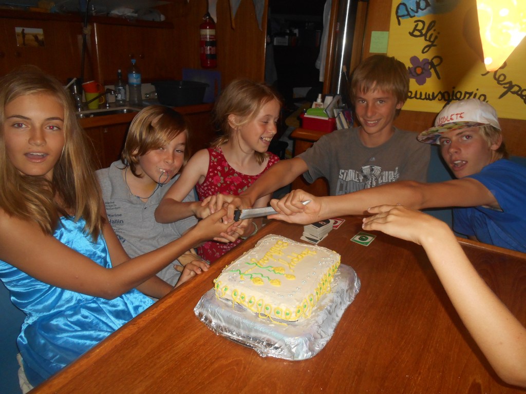 As the cruising season progressed, the kids figured out that several of them have September birthdays and that it was possible if not likely that we would not all be together for all of them. So, they got the idea to have a “September Birthday Party” in July. They ended up pulling it together while we were in Musket Cove (the second time), and they had the party on Nautilus. Victoria made a cake (of course!) and Alex and Brenden made snickerdoodle cookies to take over, and the kids all made presents for each other. The birthday kids were Brenden, Gigi (Nivana), Victoria (Fluenta), and Seppe (Nautilus). Since it was only a couple days before Alex’s August birthday, they decided it would be OK to include him to, so I guess technically it was an August/September birthday party. I wasn’t there for all of the fun and shenanigans, but luckily Nautilus shared some photos: