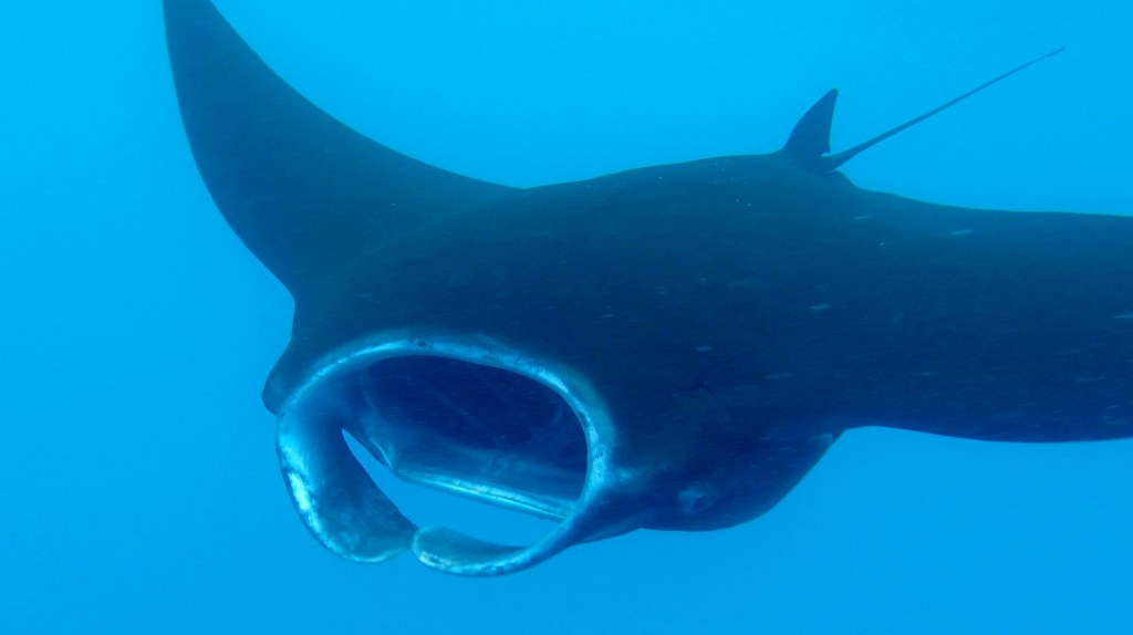 As the name might imply, the main reason people visit this location is to swim with the manta rays. At the right tidal conditions, the mantas feed in the waters between the islands of Drawaqa and Naviti. We would pay attention to the boat traffic from the resort, because they would send a scout boat out at about the right time to make sure the mantas were there, and then they’d load up a bunch of guests to go swim with them. When we saw the tourists heading out, we started gathering our gear and suiting up.