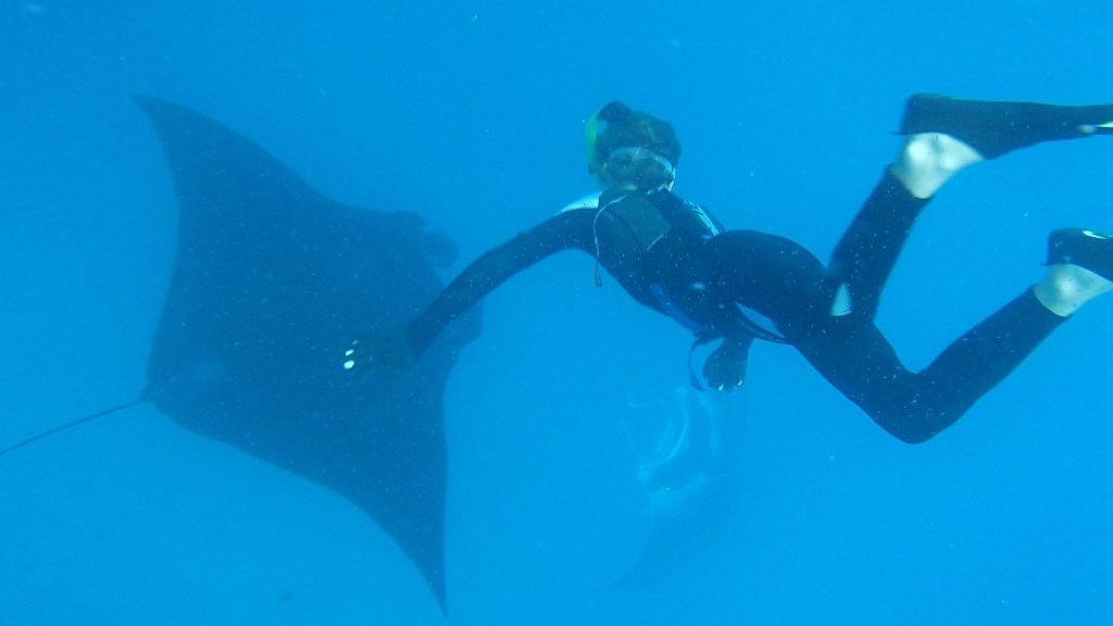 Swimming with the mantas was absolutely phenomenal, unreal almost. They are so big and majestic, and they really take very little notice of you. The bunch of tourists cleared out shortly after we got there, since they weren’t wearing wetsuits, and their stamina was much lower. Then we had the mantas all to ourselves. I enjoyed the mantas very much because they just swim around you without caring that you are there, kind of like the whale sharks in Mexico. Much better than the sting rays in Moorea that mob you because they want you to feed them. I think all of the kids could have swum with them forever, but eventually, the mantas headed off until the next feeding time. These manta photos were taken by our friends on Breeze.