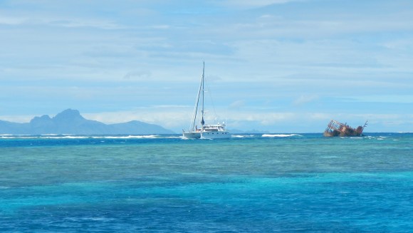 The Navionics charts for Viwa were pretty much worthless, but we had heard or read that there is a shipwreck at the pass, so when we had a visual on that, we used it to guide us in. I would highly recommend studying the high-resolution satellite imagery before attempting this pass. Luckily, we had a bright sunny day with good visibility. The pass is narrow, made even narrower by that shipwreck right in the pass. When entering, you pass with the wreck on your starboard side and the coral up nice and close on your port side. The pass is short, so you are quickly inside the lagoon, which is shallow, and absolutely stunning.