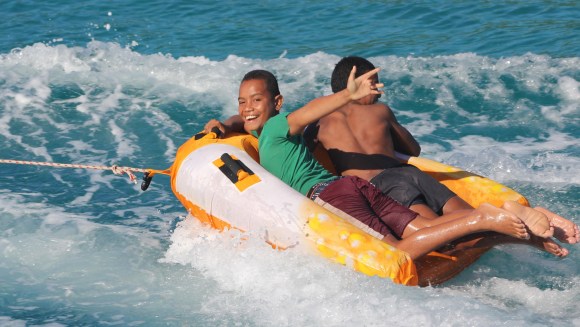 In the afternoon when we were all back on the boats, and even the spearfishermen had returned, the kids from the village became more and more emboldened, and eventually several of them swam out. Our own group of boat kids were feeling a bit cliquish and just wanted to play games together on Breeze. But that didn’t mean there was no fun to be had with the local kids, especially since our group of boat dads are really just a bunch of kids at heart. It started with just giving the kids rides in the dinghies, but then Lumbaz busted out some pull toys, and the real fun began! Lumbaz and Exodus dingies were both towing kids behind, but no one was left out. Any of the kids that weren’t being towed or didn’t fit in those two dinghies were ferried around in Field Trip dinghy to be part of the fun, and what fun they all had! Genie and I even took a turn on the banana boat, and luckily there was photographic evidence thanks to Breeze or Alex wouldn’t have believed I had done it. Surely his mom isn’t that fun, right?
