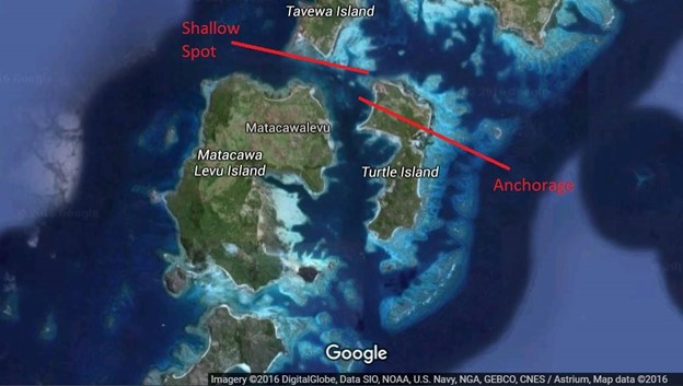 We pulled into Cucuvou Bay on Yadua in the late afternoon and visibility was quite poor. We tried to survey the bay but ended up having a much too close encounter with a bombie and so decided to just drop anchor somewhere deep and safe for the night.