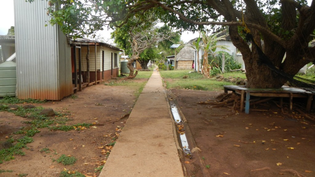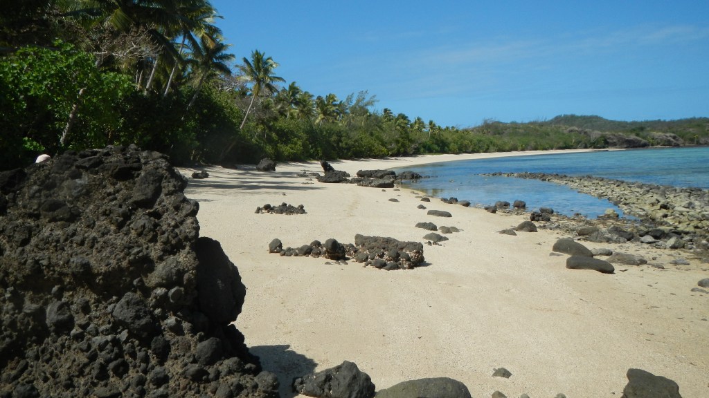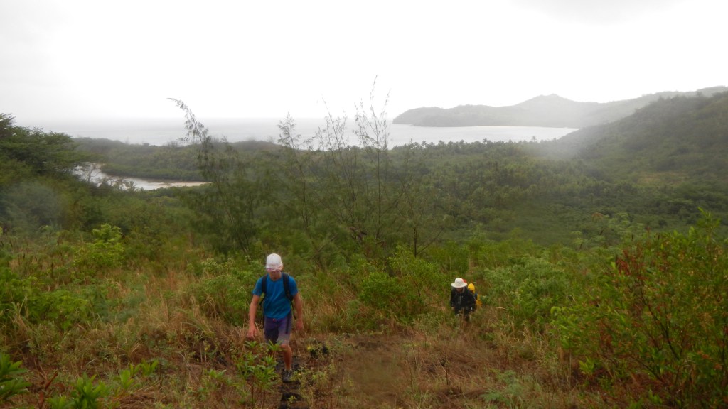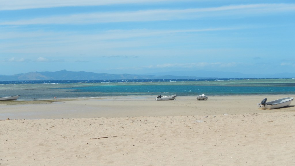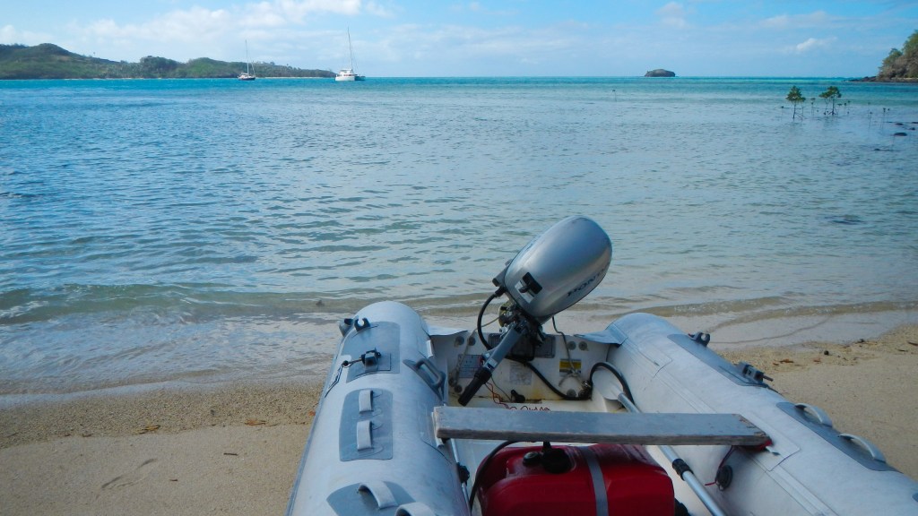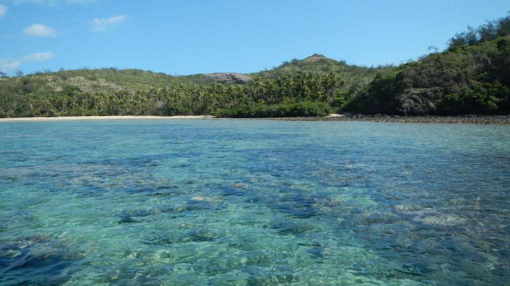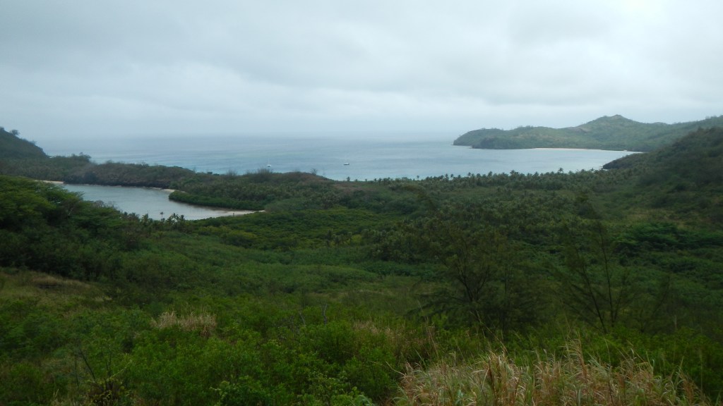 We have been 3 days in Yadua now, and so far, we are really enjoying it, even if the weather seems to want to keep us down. Our first day here we hiked 3 hours in the mud and drizzle to the village on the other side of the island. Other than the dampness, the hike was an enjoyable one, mostly along a ridge with views of the different bays around the island. The people of the village were pleasant and as usual they appreciated our effort to come and present sevusevu, and we ended up getting a ride back to our anchorage in one of their small fiberglass fishing boats (aka panga in Mexico). The primary source of income for this village is selling sea cucumbers for sale in Asian markets. They did that as well in Matuku, and there they told us they had a Korean buyer. Not sure who the specific buyer is here, but they dive every day, and while we were in the village they were filling all their dive tanks. It is unclear what the sustainability of this operation might be. Tim told me that in Matuku they said they keep having to dive deeper and deeper to find the sea cucumbers, so that seems to indicate that it may not be a long-term endeavor. Today, Tim is going to go out with them, so he’s up early having his coffee and breakfast. I made biscuits and popcorn for him to take to share with the guys. The people of this village seem to love popcorn. Anyway, since that drizzly day of hiking we’ve had clear, sunny skies, but 20+ knots of wind howling. We are in a nice, protected bay but the wind makes it quite a workout when I paddle to shore to enjoy the beach. This morning is a calm morning, though, and we are enjoying the peacefulness of it.