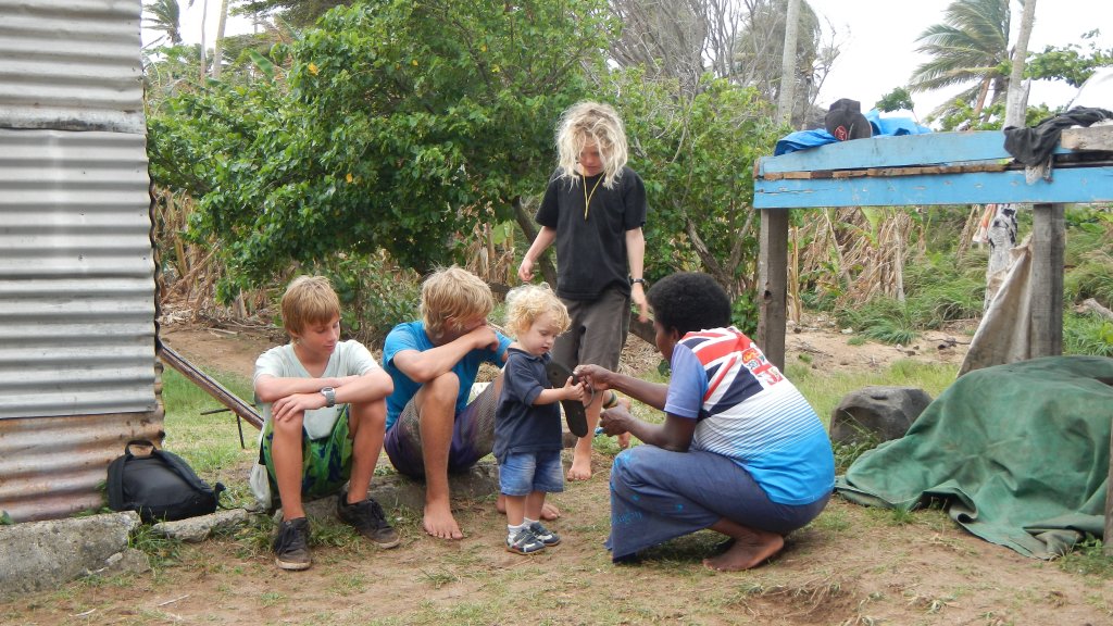 It turns out that yesterday was Father’s Day in Fiji, and so it was a special kind of church service. Instead of the pastor giving a single sermon, several dads of the village got up and read scripture and did a little of their own preaching. It was all in Fijian so we couldn’t understand a word, but it was interesting to observe the different styles of the men who were speaking. Some were quiet and reserved and some were real fire and brimstone. However, this format produced the longest church service ever! Well over 2 hours. The kids did great, and so did the adults. As usual, what really made it bearable was the singing. It’s also in Fijian, but so beautiful you feel like you can understand it anyway. After church we were invited for a big family lunch with the entire chief’s clan, something like 50-60 people including many, many kids. It was an enjoyable afternoon, and I must say that this is the nicest, most welcoming village that we’ve been to since the Lau group. We’d love to stay longer, but we are in need of internet, because we are having issues with our watermaker. It’s been giving us issues since Fulaga (a couple months ago) but it’s getting worse now, and if we need to order parts before we leave Fiji we need to get a move on that. Basically, the salinity takes a really long time to come down to acceptable levels, and it keeps taking longer and longer. We’ve suspected the membrane all along for various reasons, but Tim has been in contact with Spectra, who makes the watermaker, and he is following their troubleshooting advice before making any final conclusions. Don’t worry, we have plenty of water! But we don’t want to leave Fiji and head to more remote island groups before resolving this.