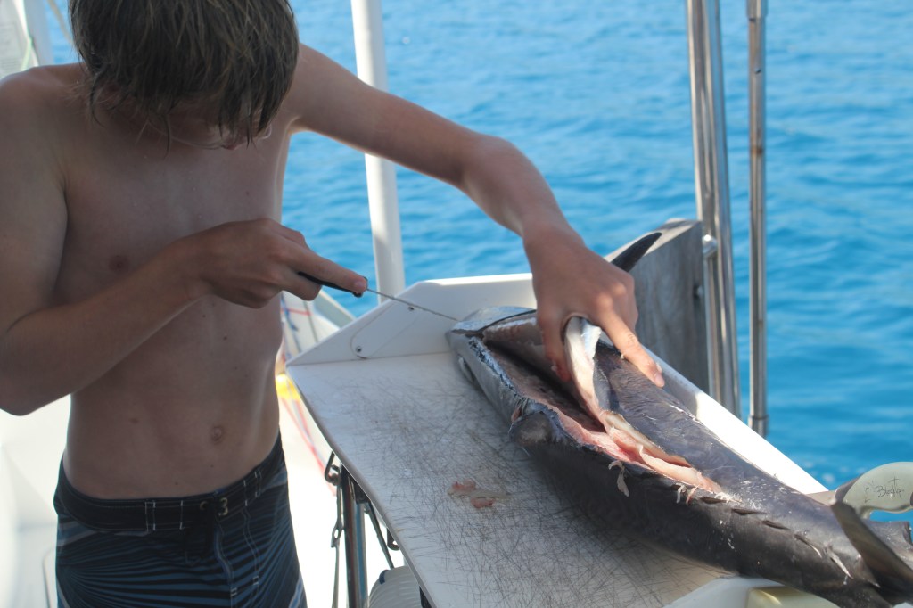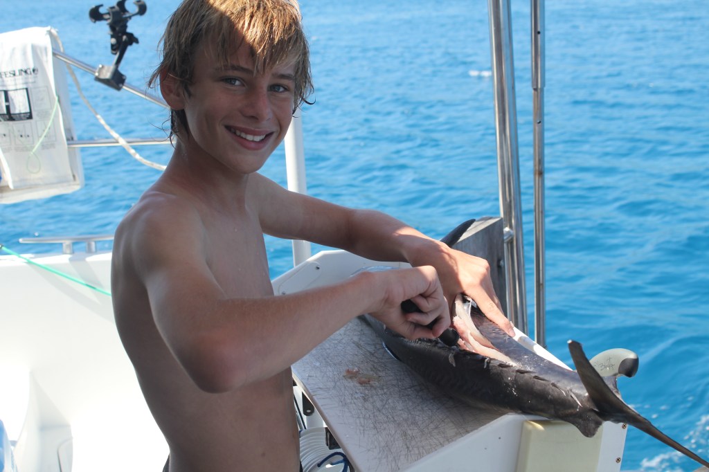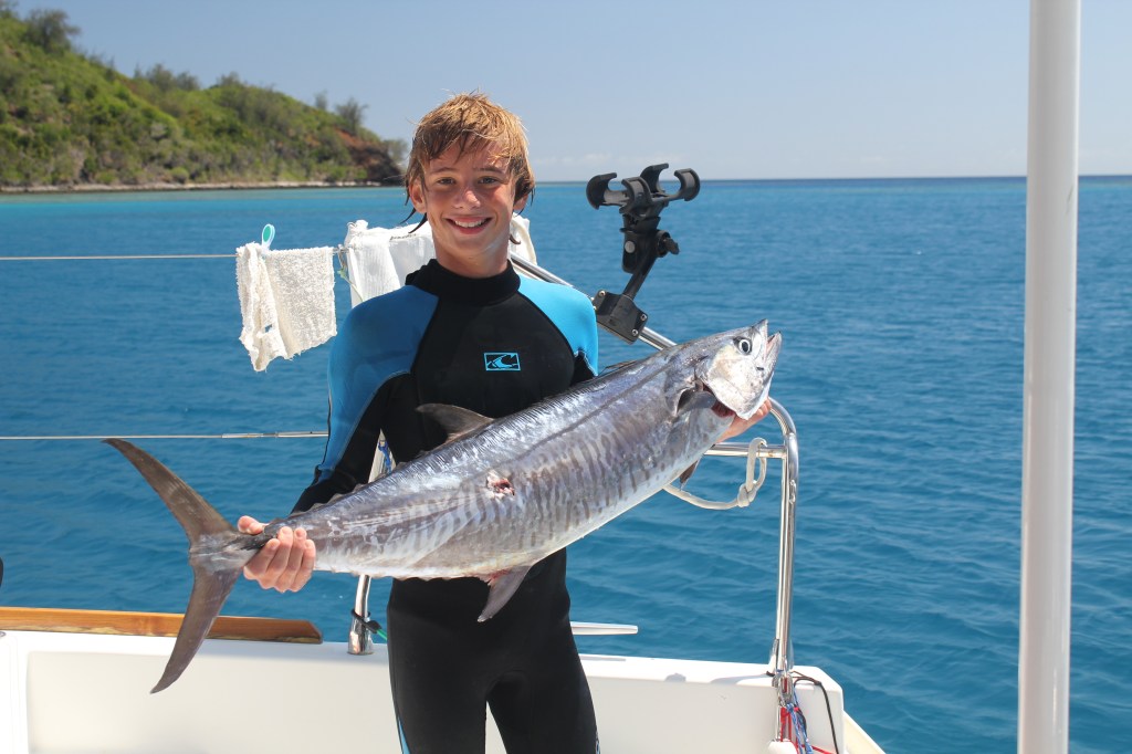 Our passage yesterday was a nice one as long as you ingnore the fact that we had to motor the whole way. Winds were light, but we picked that window intentionally since we were heading east (against the predominant wind direction) because motoring into light winds is much better than motoring into strong winds! Fishing was great — the boys caught two yellow fin tuna (our first in Fiji) and they also caught and released a skipjack tuna, a barracuda, and an unidentified.
