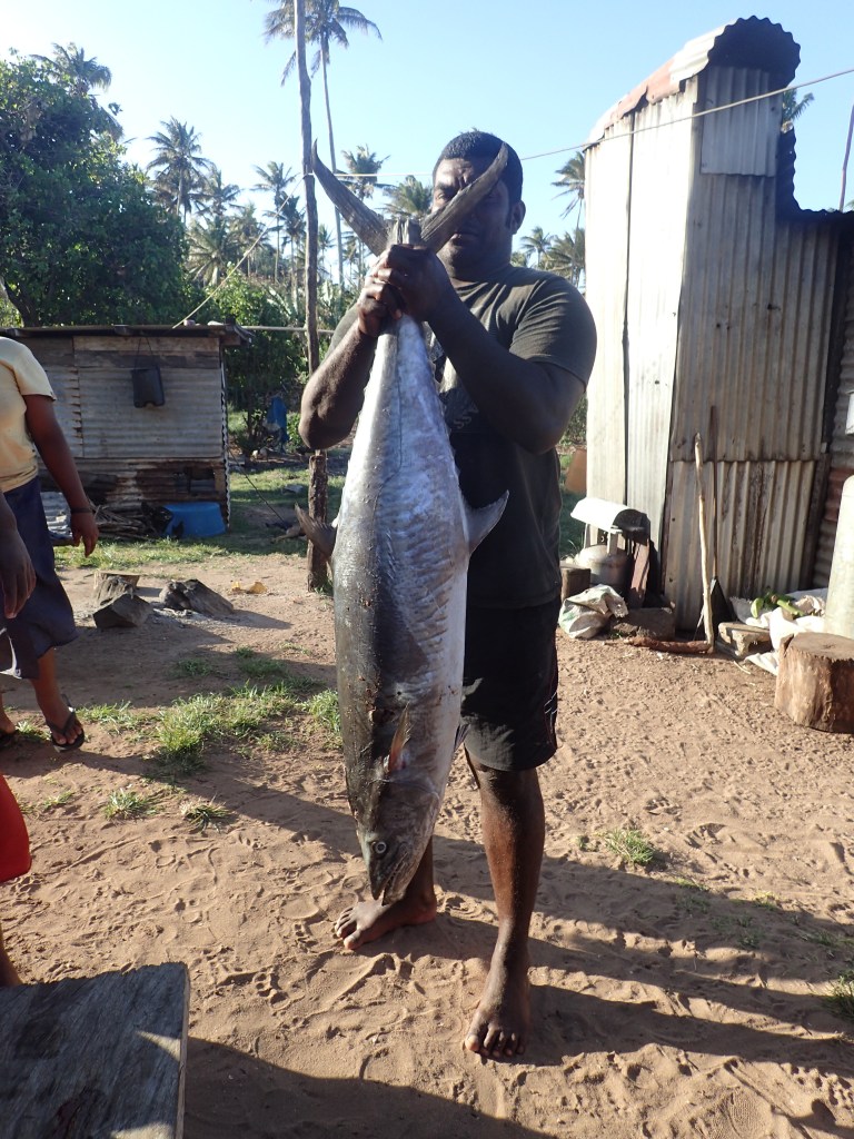 Well, the guys from the village never showed up yesterday to take Tim diving for sea cucumbers. But the upside is that the boys enjoyed snacking on the biscuits and popcorn all day. No, the REAL upside is that Tim and Max (Fluenta) went spearfishing and came back and filled both our freezers. I was just getting out of the shower when I hear them pull up in the dinghy yelling, “anybody home?” After hearing that a couple more times, I thought I should see what’s up, so I poked my head out and asked if he needed anything. His response was priceless… “just a photographer.” Clearly there was something to see so I dressed quickly, and wow, was it a sight. The biggest dogtooth tuna that I’d ever seen BY FAR, but the thing was, it was only half a tuna. Because a shark took the other half. And just the half a tuna weighed 35 lbs! And of course, they also came back with a couple good sized walus as well. I told Tim we may need a fishing ban now, and he gave me the stink eye. We have saved the heads from all these fish to give to the village, and as you might imagine the tuna head is enormous, but somehow Fluenta’s magic freezer was able to accommodate it. We think we’ll move around to the other side of the island today or tomorrow so we can go to the village for church on Sunday, so we’ll have to keep the fish heads in our freezers until then.