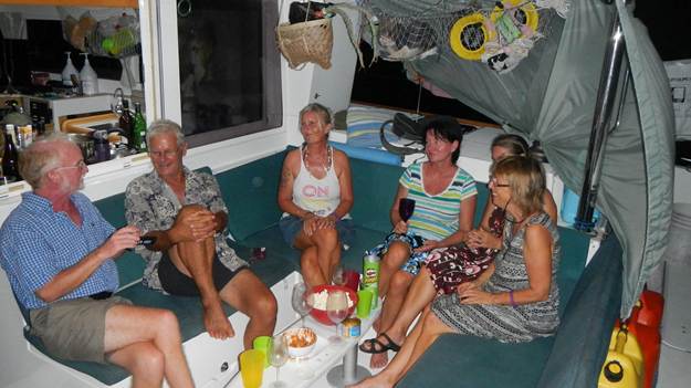 And we had another encounter with a “blast from the past” while anchored in Funafuti. Sally is a woman we met way back in Mexico and we had also run into her in The Marquesas. She crews on different boats and manages to see the world that way. Imagine my surprise when a dinghy pulls up to Exodus and there’s Sally with a warm greeting for us. So, we had a get together on Exodus with all of our old and new friends to catch up and get to know each other better.