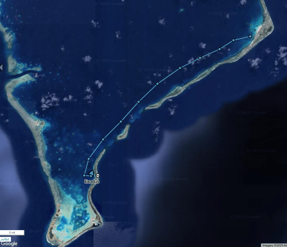 After lunch everyone piled into the back of a pickup truck and headed to the stadium for a big rugby game. Tim and the boys joined them, but I stayed behind “with the women”. Shortly after, I noticed that the wind was blowing from a strange direction, from the NW, so I headed back to Exodus. With this wind direction we were laying exactly perpendicular to a lee shore facing the fetch from across the entire lagoon. But the wind was only 11-12 knts, so I set an anchor alarm with a tight tolerance, and sat down to do some writing without worrying. I actually thought to myself, “If it were blowing 25 kts, then I’d have something to worry about.”