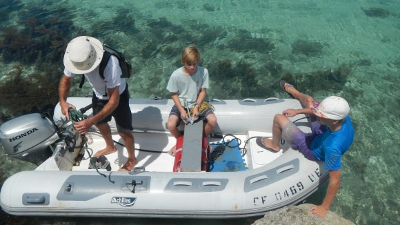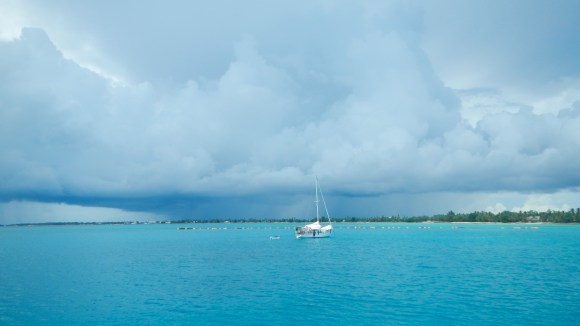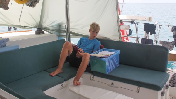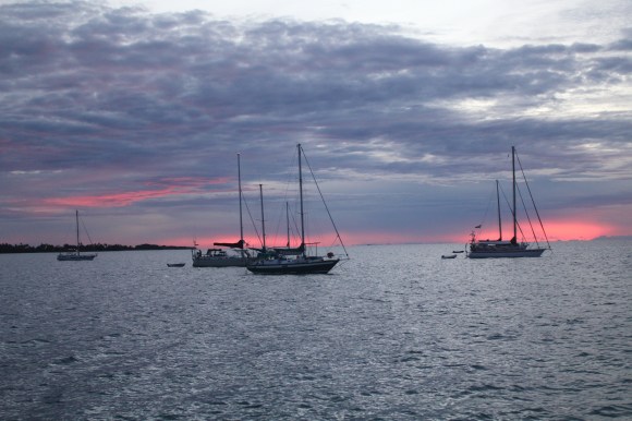Most of the boats in the fleet here (we are 9 total now!) have moved down to anchor in the southern end of the lagoon to get away from the “big city” for a couple days. We’ve met a lovely couple from Sweden who cruised with their 3 boys when they were younger, and they organized a bonfire on the beach yesterday. They were going in to get the fire started, and they radioed to see if the boys would like to come help. I thought it was a very nice gesture, and I all of a sudden realized how important it is for the boys to have time with people without Tim and I around, so they can forge their own relationships. No, it’s not other kids, but there’s no reason they can’t get to know the adults too. Alex was happy to take his machete and get coconuts for everyone. After about 45 minutes they came back to get Tim to join the party too, while I stayed on board to enjoy the boat to myself. In case you were wondering, yes, I did walk around naked in the rain. Just because I could.