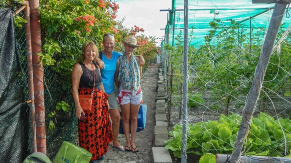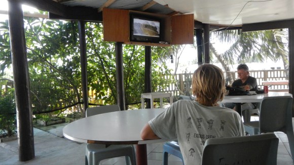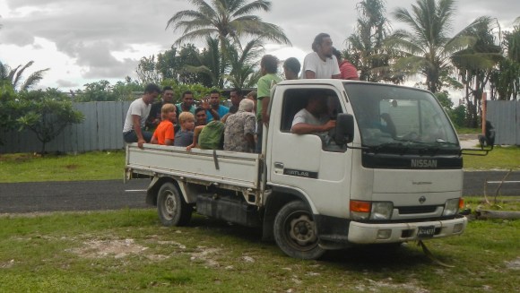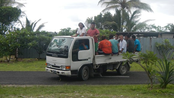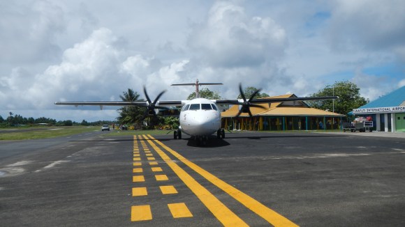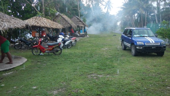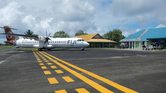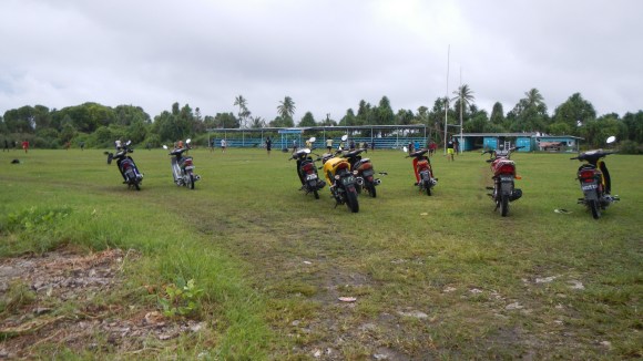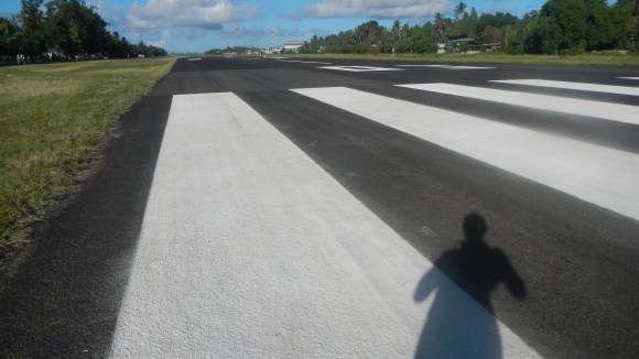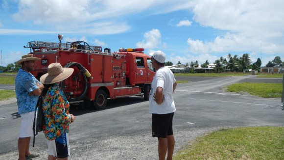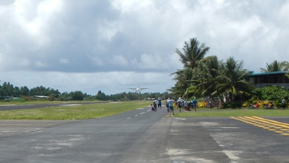 I love this place! To write about everything we’ve been doing and seeing would take a couple pages, so let me just share about the airstrip here. The island is long and skinny and slightly boomerang shaped, and there is an international airport right in the middle of it. A plane comes from Fiji twice a week, and all other times the runway serves as a place of fun and activity for everyone. One of our first evenings here, Tim and I went for a walk before having dinner on shore, and there were rugby and soccer games going on, people running and walking, and people on their scooters buzzing down the runway. Then it’s always big excitement when the plane comes, and we caught the bug and went ashore to watch the plane land. A fire engine sounds three sirens to warn people to clear the runway because the plane is coming, and even then there are scooters crossing at the last minute. We stood right, and I mean right on the edge of the runway as the plane landed. Where else can you can you do something like that at an international airport?