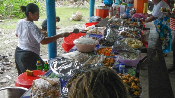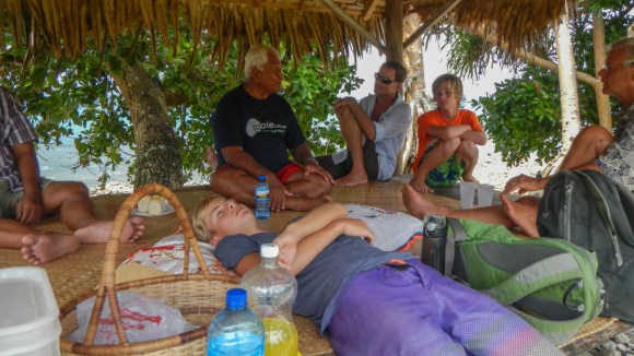 So, the picnic yesterday was great, I would say abut 50-60 people including lots of kids. They cooked a pig in a lovo and they also BBQ’d chicken. They apologized that there wasn’t any fish, but they said the boys who normally do the fishing were practicing rugby and didn’t have a chance to go fishing. Alex was OK with that. The picnic was down at the very southern tip of the island, about a mile away, so we took Navire and Exodus down there and anchored off the beach. It wasn’t a great anchor spot since it was steep to, so we were close to shore without a lot of chain out, but as long as the wind direction and strength stayed the way it’s been for the past week, nothing to worry about.