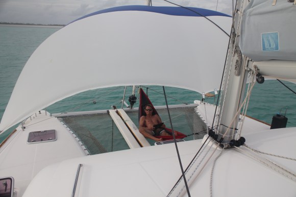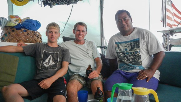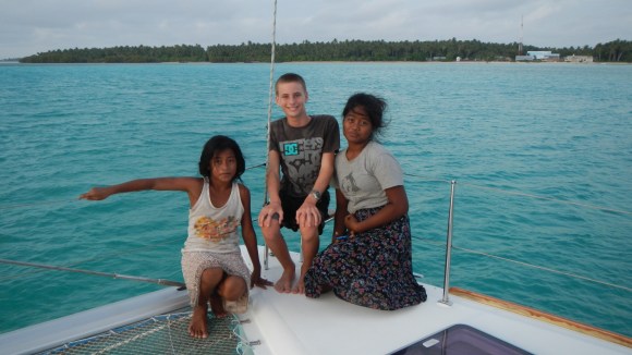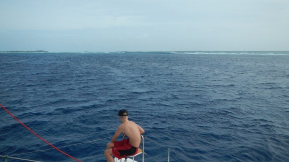 We arrived outside the pass yesterday afternoon at low slack tide and after Tim and Alex scouted the pass in the dinghy we decided to anchor outside the lagoon for the night and wait for the morning high tide. There was huge, long period swell coming at us from the south, so it was a somewhat uncomfortable night out there. Tim tried to make up for it by looking for lobster, but no luck. He only saw one, and it got away. Coming in the pass this morning, and all the way across the lagoon for that matter, we navigated totally by eyeball. Tim was at the helm, I was on the top deck, and Alex and Brenden were each on one of the bows and everyone’s job was to look for shallow coral heads. This was harder than you might think because 1) there was about 15 kts of wind on the nose and the small wind chop made it hard to see into the water, and 2) we were basically going over a sea of coral heads at 10-15 ft deep and we were trying to spot any tiny pinnacles that might stick up shallower than our draft, which is 4 feet. Tim says it was a piece of cake, but I found it quite stressful… no surprise given our personalities.