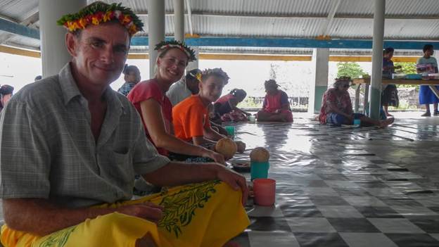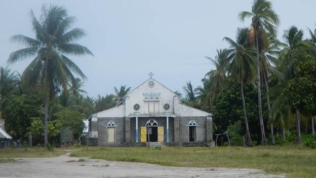 As mentioned earlier, we arrived at Aranuka on New Year’s Day and we were immediately invited to shore by Martin, Aranuka’s MP, to see his house, tour the village, and see some traditional dancing. As we were walking around the village, A man called Martin over, and then Martin called us over and introduced us. It turns out the man was the minister of the protestant church, and he wanted to invite us to his church’s celebration that day for lunch and to see some dancing. We were all for it but then after we walked away Martin explained that there’s also a Catholic Church and they will also have dancing. After further conversation and a little prodding, we found out that Martin belongs to the Catholic church, so that was likely where he was planning to take us before we got invited by the Protestant minister. We asked Martin for advice on what we should do and he was very diplomatic, saying we should do what we feel we want to do, so in the end we decided to try to attend both.