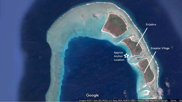 The weather forecast said we were in for some stronger trades, so we joined three other boats (Pojean, Mariposa, and Anahata) up in the northernmost part of the atoll for some better protection. We anchored off the islet called Enijabro, and you can see the geography on the satellite image below: