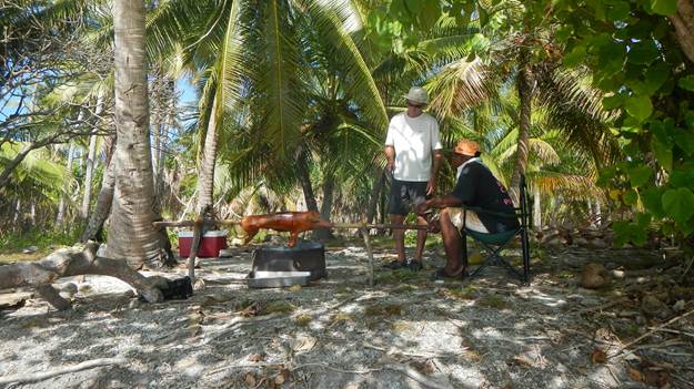 Since we had a group of boats together we decided to do something crazy and have our own pig roast. James from Pojean arranged to purchase a pig from some folks from the village on Enejelar, and we all pitched in. Part of the deal was that they would slaughter it for us, but that we would roast it ourselves. James was pretty much in a huff when he picked up the slaughtered pig since they had taken the ears, and apparently the ears are somewhat of a delicacy. Anyway, there is a homestead on Enijabro, and Tim talked to the guys there to get their permission for us to roast the pig, and it didn’t take long for them to volunteer to help. It’s a good thing too, because they knew what they were doing, and we clearly did not. We took our instant read meat thermometer ashore, and I’m sure they must have been mocking us in Marshallese about that!