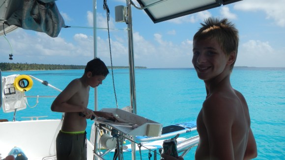Anyway, our passage to Kwajelein was a pleasant downwind run and we made great time, pulling up to the dock at the Army base early afternoon. And now it’s just like being in a small town in the U.S. I’m ready to leave already, but apparently the teenage population here is skewed more girls than boys, so A & B are already getting a lot of attention. So, how can we just rush off? We are checking into whether they can attend the school for a few days while we’re here, and Brenden’s really excited at the thought. I think Alex is too, but as usual he’s a little more cool about it.