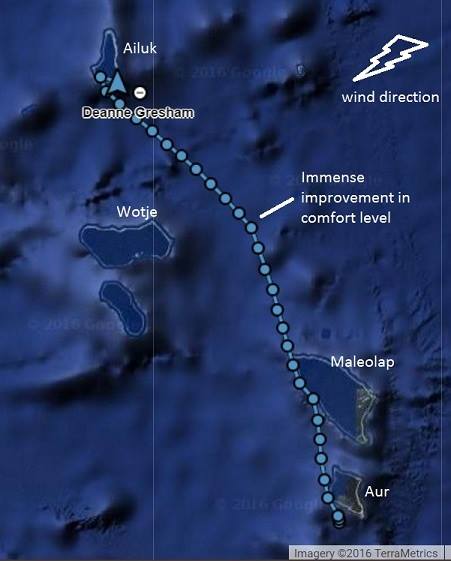 The first night was ridiculous. I’m pretty sure I didn’t sleep a wink off-watch because I kept catching air while laying in bed. We got a little bit of relief from the sea state as we hugged the coast of Aur and Maleolap on our way by (see satellite image to the left).