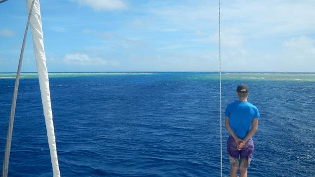 We entered the pass on the southwest side of the atoll. There are three more commonly used passes up on the northwest side, but we thought we could save some time if we used this pass and by all means it looked viable on the satellite imagery. Unfortunately we had poor timing and when we arrived we would have had the sun in our faces as we transited the lagoon over to the village. And we had been told that Ailuk has lots of bombies in its lagoon, so we decided to wait until the sun was a little more overhead before we went in. While we waited Tim and Alex dropped the dinghy and went on a scouting mission as Brenden and I just floated around in Exodus. Once we entered the lagoon we had a couple of miserable hours bashing upwind as I stood on the roof on bombie watch. In the end I’m not sure we saved that much time since both the sun angle and the wind angle from the northern passes to the village would have been a lot better. Oh well, it’s always an adventure, and you learn as you go.