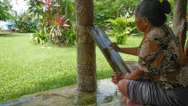 Tapa making… here she is using water and a shell to thin and flatten the bark (of a paper mulberry tree).