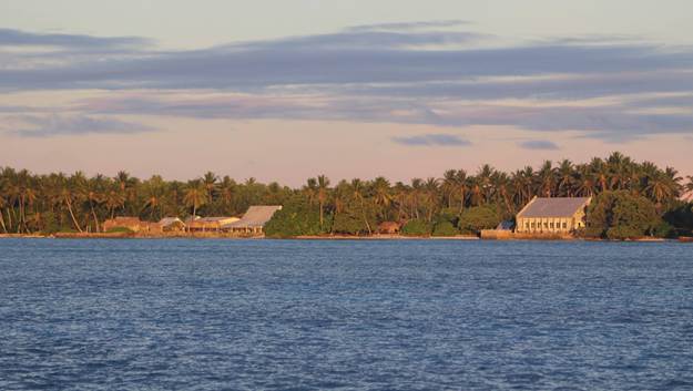 We were visited by two local policemen who were dressed in a very official manner and who were extremely professional and polite. We invited them aboard, offered them some cookies, and basically told them the truth. We were headed to Funafuti and had planned to stop in Tarawa, which is the only official port of entry, but the wind was good, so we kept going, and now the wind is not good, so we needed to stop. They took down our passport numbers and told us we could stay and even gave us permission to go ashore to the village. We knew they would likely report us to the officials in Tarawa, and after that they might have to tell us to leave, but since it was Friday afternoon it was likely nothing would happen over the weekend, so we could relax for at least a couple days, and hopefully there would be weather to leave by Monday.