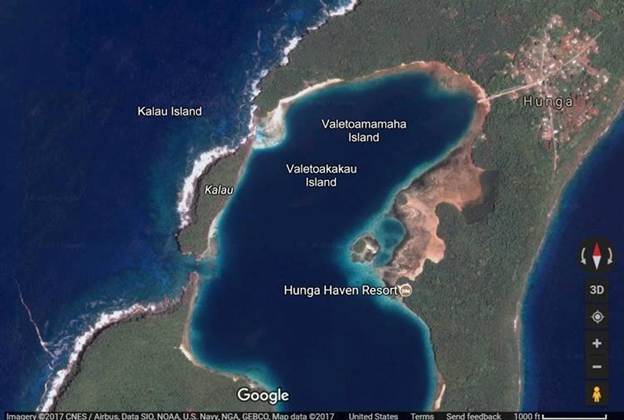 After we had spent a few days in Neiafu and had made our reservation for the boatyard a few days later, we decided to join Del Viento for a little getaway in Hunga Lagoon. We had been there twice before, once with Lady Carolina when Yi and Johnny were visiting and once with Dad and Karen. Both times we had anchored on a small shallow patch on the south side of the lagoon (near the Google logo on the satellite image below). This time around we snagged one of the new mooring balls at Hunga Haven.