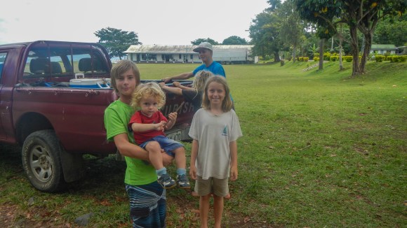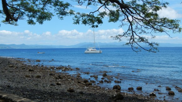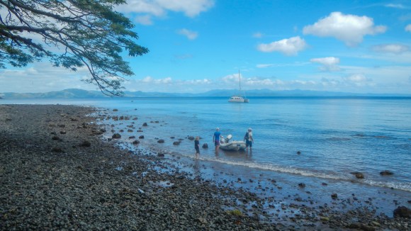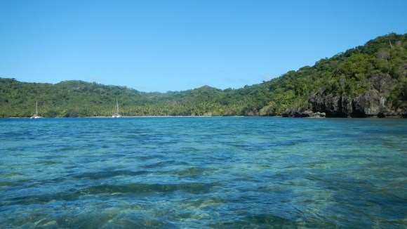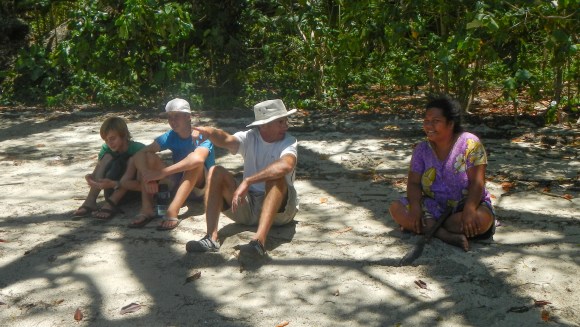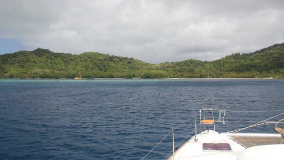 So, the picnic yesterday was great, I would say abut 50-60 people including lots of kids. They cooked a pig in a lovo and they also BBQ’d chicken. They apologized that there wasn’t any fish, but they said the boys who normally do the fishing were practicing rugby and didn’t have a chance to go fishing. Alex was OK with that. The picnic was down at the very southern tip of the island, about a mile away, so we took Navire and Exodus down there and anchored off the beach. It wasn’t a great anchor spot since it was steep to, so we were close to shore without a lot of chain out, but as long as the wind direction and strength stayed the way it’s been for the past week, nothing to worry about.