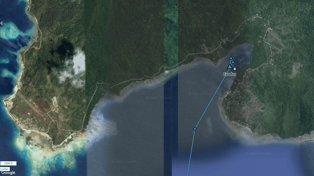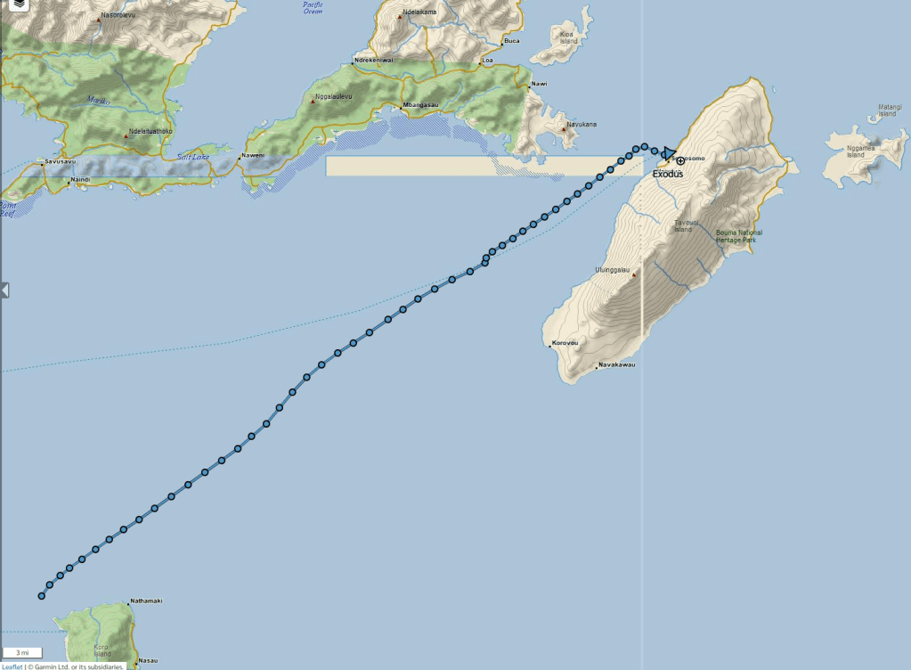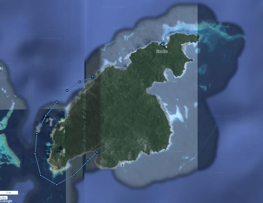 So, by the time we’ve completed our man overboard drills it’s completely dark. We follow our track back to the main anchorage as Exodus bounces all around and things fly around the salon and galley, like books, apples, wine bottles. As we approached the anchorage we were able to make out all the anchor lights and one of the boats was broadcasting AIS, which helped get us oriented to the layout of the anchorage in the dark. We were able to make it close to our original anchor spot, but out a little further in order to have more room. We put out plenty of chain and got the anchor set and shut down the engines. At this point the squall passed and the wind died down.