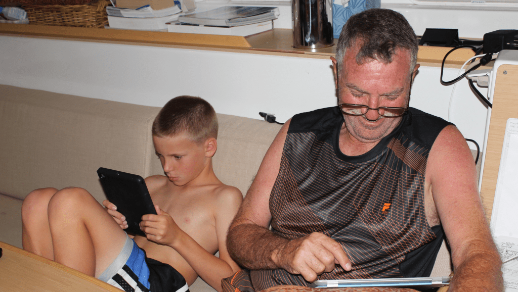 Got up and went for a snorkel first thing! It was so wonderful! Like swimming thru a huge aquarium! Saw a Balloonfish (so cute!), lobster, Seargent majors, Hogfish, pencil fish, rays and so many others! Loved it! Swam back to the boat for Dee’s great pancakes and the guys were off for another spearfishing adventure! This time Alex got one! He was so excited! And Brenden was excited for him! They all took off for a little get together on the beach with the other kid boats and G and I stayed on board for a little downtime!